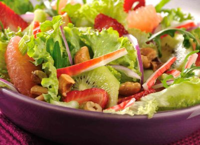 Ensalada de lechugas, frutas y nuez de la india
